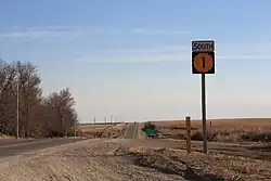 K‑1 highway was originally established sometime between 1918 and 1932.[5][6] Originally, it ran much farther to the north than its current terminus, passing from the Oklahoma–Kansas border south of Coldwater north through Greensburg, Kinsley, western sections of Pawnee County, La Crosse, Hays, Plainville, Stockton, and Phillipsburg to a northern terminus just northeast of the town of Woodruff.[6] It terminated at K-22, which was later known as U.S. Route 83, close to the border with Nebraska.[6] In 1941, the majority of K‑1 (except the southernmost section) began to be replaced with US‑183, beginning with the section between Rozel and Plainville.[6][7] By 1950, US‑183 had replaced all but the current alignment of K‑1.[8] It was not until 1953 that the entirety of K-1 was paved, as the section of K-1 that comprises the current alignment was not paved until between 1950 and 1953.[8][9] Since 1953, K-1 has remained at its current alignment.[2][9]