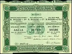 By 1873 Konstanty Rudzki was able to acquire all outstanding shares in the company for a price of 51,600 roubles.[4][10] However, he over-invested and the company could not repay its debt of 12,000 roubles so in 1878 Konstanty Rudzki was forced to find new partners.[4][11][10] Eventually he retained 52 percent of shares, with the remainder in the hands of Alfred Czarnomski, Władysław Mazurowski and Józef Korycki.[4][12] Since then the company started to expand rapidly. In 1879 there were 221 workers employed in Rudzki's Warsaw works, by the end of the 19th century the number rose to 890, while value of production rose from 180,000 roubles to 2,132,000 roubles.[4] In 1892 the company was also formally transformed into a joint stock company.[4][13]
