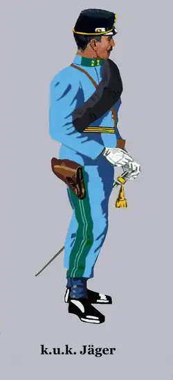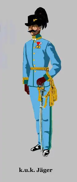 The Feldjäger were established in 1808 as Jäger infantry in the Empire of Austria and later formed part of the regular infantry of the Common Army, only their peacetime uniform distinguishing them. The designation Jäger for the soldiers and Feldjäger for their units had purely historical reasons, as light infantry and skirmisher units had been abolished in 1866.