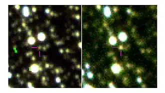 ![]() Images from the Canada-France-Hawaii Telescope showing the difference in brightness of a star during the passage of the microlensing created by the exoplanet and its host star.[1] | |