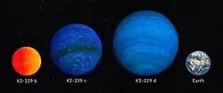 K2-229d is another Mini-Neptune with a radius of 2.64 R🜨, meaning it is likely gaseous. Only a maximum mass of 25.1 M🜨 could be determined. The planet was detected by a single transit event lasting about two and a half hours long. There were two models for its orbital period: one where it took about 31 days to orbit and the second transit was during a large data gap; and another where it took over 50 days to orbit. The latter scenario was considered unlikely, as K2-229d would need to have a very eccentric orbit to exhibit such a short transit duration – so eccentric that its periapsis would cross the orbit of K2-229c and destabilize the system. It has an equilibrium temperature of 522 K (249 °C; 480 °F).[4]
