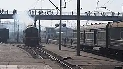 At least three of the ex-Russian locomotives that have entered service, 862, 863 and 870, are of the DM62 type.[12] The DM62 was a variant of that, originally delivered to the Soviet Army between 1982 and 1994. These were operated by the 10th, 52nd and 36th Guards Missile Divisions of the Soviet Army to pull the combat missile trains in which RT-23UTTKh rail-mobile ICBMs were carried.[13] The DM62 differs from the standard M62S by a number of changes designed to improve the reliability and survivability of the locomotive; some of these changes were later incorporated into the design of the (2)M62U. External spotting differences include the bogies, the rectangular housings for the headlights, and the box between the headlight on which the number plates are mounted. Other differences include heat sensors in the journal boxes, automatic starters for the engine, blackout shields, and multiple-unit operation regardless of the locomotives position in the train.[14] Following the dissolution of the Railway Rocket Troops in 2000, these locomotives were transferred to the Russian Railways.