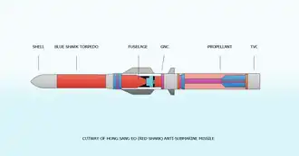 The K745A1 Red Shark (Korean: 홍상어; RR: Hong-sang-eo) torpedo, also called the K-ASROC, is a vertically launched anti-submarine missile successively developed and tested by Korea University of Science and Technology, the Agency for Defense Development (ADD) and the Republic of Korea Navy in 2009.[2] The Red Shark missile has a range of 12 miles (19 km)[3] and carries a K745 Blue Shark torpedo that is deployed by parachute near the intended target. After release, the Blue Shark independently searches for the target.