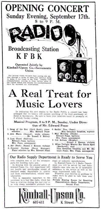 - ^ "KFBK in Rare Tune For Sunday Night's Big Radio Concert", Sacramento Union, September 16, 1922, page 8.