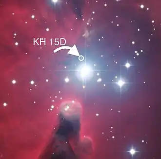 - ^ Herbst, William; et al. (2010). "The Light Curve of the Weakly Accreting T Tauri Binary KH 15D from 2005-2010: Insights into the Nature of its Protoplanetary Disk". The Astronomical Journal. 140 (6): 2025–2035. arXiv:1007.4212. Bibcode:2010AJ....140.2025H. doi:10.1088/0004-6256/140/6/2025. S2CID 118391852.