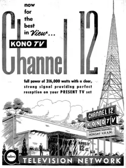 Channel 12 was the last commercial VHF allocation in San Antonio to be awarded. The first applicant for the allocation came in June 1952, from Bexar County Television Corporation, a subsidiary of Alamo Broadcasting Company, owners of radio station KABC.[3] Bexar County Television planned to operate channel 12 as an ABC Television affiliate, owing to the radio station's affiliation with the ABC radio network.[3] Shortly thereafter, Mission Broadcasting Company, owners of KONO radio (860 AM and 92.9 FM), also applied for a channel 12 license.[4] By 1953, both Bexar County Television and Mission Broadcasting proper had dropped out of the running for channel 12. However, two new applicants filed applications: Sunshine Broadcasting Company, then-owners of KTSA radio, and Mission Telecasting Company. Mission was majority (50%) owned by Eugene J. Roth, principal owner of Mission Broadcasting Company, with the other half of the company split among seven individuals.[5]