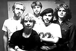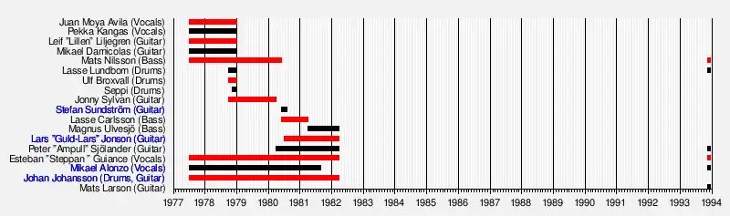 Johan Johansson,[7][8] Mats Nilsson and Pekka Kangas began a band called "Ingenting" (Swedish for "nothing"). Their first and only gig was at Österholmsskolan in Skärholmen. In the autumn of 1977, most of the members of Ingenting went to Skärholmens Gymnasium, and discovered that if one worked with a project, like a band, one would not have to go to all of the classes. "Skärholmens Gymnasiums Punkensemble" was started; since many students did not want to go to class, the band quickly grew.[9] After a chaotic gig in the aula in Skärholmens Gymnasium with 15 band members, of which 5 were singers, the project "Skärholmens Gymnasiums Punkensemble" was over. The singers Stephan "Steppan" Guiance and Michael Alonzo, drummer Johan Johansson, and bassist Matte Nilsson continued and became the only constant members of KSMB, as the band was renamed in 1978. KSMB is an acronym that stands for "Kurt-Sunes med Berit", a name taken from a sketch in the radio program Hemma hos.[10]