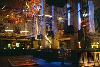 The club was renowned for featuring international stars of the techno, house and pop scene. The New Yorker David Morales was the premiere guest at the regular Saturday event called World League, which was held for the first time on 31 October 1996.[6] Alongside Morales, international star DJs and live acts such as Sven Väth, Carl Cox, Paul van Dyk, Armand van Helden, Daft Punk, Masters at Work, Talla 2XLC, Marc Spoon, DJ Sneak, Frankie Knuckles, Bob Sinclar or Westbam performed regularly and often exclusively at the KW, when they were in Munich. Likewise, international pop stars such as Boy George or Jimmy Somerville of Bronski Beat chose the KW for their concerts.[4][7] Such events then frequently attracted thousands of visitors, many of them arriving from afar, to the Kunstpark Ost,[8] and soon the KW had built up a reputation all over Europe.[9]
