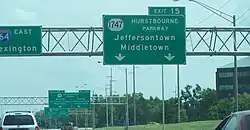 An extension towards the General Electric Appliance Park was completed in 2005, connecting the existing Hurstborne Parkway with Fern Valley Road (then-Kentucky Route 1631), creating another loop around the southeastern end of Louisville located midway between Interstate 264 to the north and Interstate 265 to the south.[2] KY 1747 was then extended westward along the length of Fern Valley Road to its current terminus at Grade Lane, replacing KY 1631, which was then reassigned farther downtown.[3]