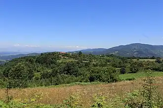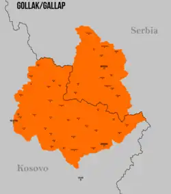 Gollak (Albanian definite form: Gollaku; Serbian: Гољак, romanized: Goljak) or Gallap (Albanian definite form: Gallapi) is a mountainous and ethnographic region in the eastern part of Kosovo and partially in Serbia, bordering the Llap region to the North, the Kosovo field to the west, the Anamorava valley to the south and straddling along the border with Serbia.[2] The cities of Pristina and Gjilan in Kosovo are located by the mountains. The highest peak, Bjeshka e Artanës, has an elevation of 1260 meters 1,260 m (4,134 ft) above sea level.[3] Gollak itself is split into Upper Gollak and Lower Gollak.