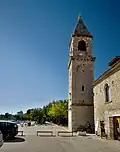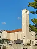 Only the bell tower remained of the parish church built in the 16th century after Allied bombing in 1943. Kaštel Sućurac was bombed on 5 and 6 December 1943 by the Allies. In the attack, a parish church from the 16th century was destroyed, resulting in the deaths of 67 locals, including the parish's priest.[6][7][8] On 13 December, another 38 were killed.[9] In the communist Yugoslav era, the victims of the bombing were declared victims of fascism, which lasted until democratic changes in Croatia in 1990.[6] In 2007 the town raised a monument to the victims.[9]