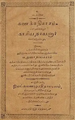 Kaṇakkatikāram is a Tamil mathematics book believed to have been written by Kari Nayanar hailing from Korakaiyur in Cholanad. Considering the internal evidences, the work has been dated to 15th century CE. "It is significant that the mathematical methods found in these delve into the material life of the people and approach the dimensions of daily labor enumeratively."[1] According to the author, the contents of the book are based on material available in standard Sanskrit treatises on mathematics like 'Līlāvatī".