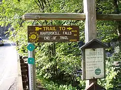 The Kaaterskill Falls Trail was built during 1967 as the southern terminus of the popular Escarpment Trail,[12] which runs along the ridge that bounds the Catskills to the northeast. During the late 1980s, DEC had to close the trail above the falls and build a new southern section along Schutt Road to limit the state's liability for injuries and fatalities that occurred near the falls.[12] Nine people have died at Kaaterskill Falls between 1988 and 2021.[13]