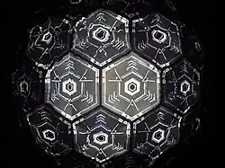 Images are projected through a screen and reflected by three mirrors into a spherical shape.[2] Viewers lean against sloped padded boards that allow them to look up to the kaleidoscope.[3]