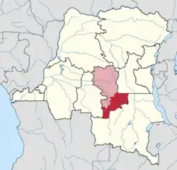 A 1955–1957 map shows that Sankuru District had been divided into a smaller Sankuru District to the north and a new Kabinda District to the south. Kabinda District bordered Sankuru District to the northeast, Maniema District to the north, Tanganika District to the east, Haut-Lomami District to the south and Lulua District to the west.[6] The area of Kabinda District was 61,800 square kilometres (23,900 sq mi) out of a total of 323,100 square kilometres (124,700 sq mi) for Kasai province as a whole.[7]