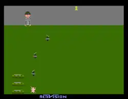 Following Kaboom!'s release, other companies developed similar games, such as Lost Luggage (1982) by Apollo and Eggomania (1983) by U.S. Games.[29][45] TV Gamer described these games as "Catch 'N Score" where players must catch falling or moving objects coming towards you to score points.[46] In 1983, Jim Clark reviewed Crackpots (1983) in Videogaming and Computer Gaming Illustrated, lamenting that Activison has reached a point of saturation with the Kaboom!-themed games of catching or tossing objects with games like Spider Fighter (1982) and Oink! (1983).[47] Three follow-ups to older Activison properties were shown at the Summer Consumer Electronics Show in 1991 for the Super Nintendo Entertainment System, including Kaboom!: The Return of the Mad Bomber that never released.[17][48]