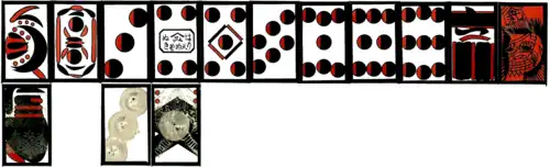 Other small single-suited regional card patterns such as "Komaru" (小丸), "Mefuda" (目札), and "Daini" (大二) may also be classified as Kabufuda.[6] These patterns are based on the Latin coin suit, have one of their 3's specially decorated, and have an additional Onifuda that acts as a wild card.