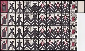 Like hanafuda, kabufuda is a descendant of mekuri karuta. Since suits are irrelevant in kabu games, all decks became single-suited during the 18th-century.[1] Like in baccarat, the object of most kabu games is to get a total closest to nine.[2] Early kabufuda decks had three ranks of face cards but since they have no value, only the jacks were kept. Kabu is believed to derive from the Portuguese slang cavo meaning a stake, bet, or wager.[3] Closely related are the gabo games played with Korean tujeon cards[4] and the Indian Ganjapa game of komi.[5]