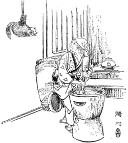 As the story goes, a man caught a troublesome tanuki in his fields, and tied it to a tree to kill and cook it later. When the man left for town, the tanuki cried and begged the man's wife who was making some mochi, a sweet rice dish, to set him free, promising he would help her. The wife freed the animal, only to have it turn on her and kill her. The tanuki then planned a foul trick.
