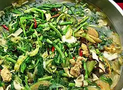 This curry is made mainly with vegetables and herbs. Chicken,[2] frogs,[3] beef, dried fish or snails[4] are added depending on the variant.[5]