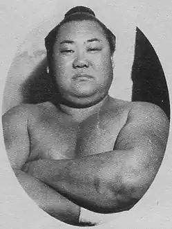 Making his debut in 1921,[1] he inherited the shikona, or ring name of the founder of his stable and 19th century ōzeki, Kagamiiwa Hamanosuke. He won his first championship in the jonokuchi division in May 1922. He achieved 6 straight winning records and was promoted to makushita in 1925. He then won the makushita championship in May 1927 and was promoted to makuuchi in 1928. He secured his first kinboshi or gold star in January 1930 with a win over Miyagiyama, the first tournament in which the system was introduced. During the January 1931 tournament, he was runner up for the championship. He did not wrestle in 1932, but returned in 1933 and reached his highest rank of komusubi in May 1934. He was runner up for the championship a second time in January 1935 and reached the rank of sekiwake in January 1936. In January 1937, he was promoted to his final rank of ōzeki, simultaneously with Futabayama. At the age of 34 he was the oldest ever to be promoted to ōzeki. In January 1939 he had a bout with Banjaku that went on so long a rest break (mizu-iri) was called. Kagamiiwa chose to forfeit the re-match and so was given a loss by default (fusenpai) but his opponent sportingly refused to accept a default win, so both wrestlers were marked with a loss.