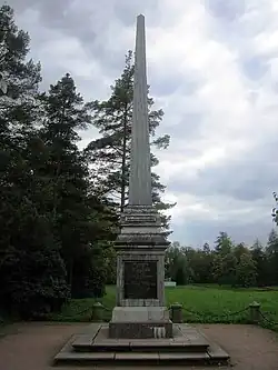 The Kagul Obelisk (Russian: Кагульский обелиск) in Tsarskoye Selo is one of several such structures erected on behest of Catherine II of Russia in 1772 to commemorate Pyotr Rumyantsev's victory in the Battle of Kagul. Designed by Antonio Rinaldi, the dark grey-and-red marble obelisk stands in the landscape park of the Catherine Palace.