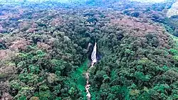 With an area of 6,000 km2 (2,300 sq mi), Kahuzi-Biega is one of the biggest national parks in the country. Set in both mountainous and lowland terrain, the park lies west of the town of Bukavu in South Kivu Province.[5] The smaller, 600 km2 (230 sq mi) eastern part of the park lies in the Mitumba Mountains of the Albertine Rift in the Great Rift Valley. The larger, 5,400 km2 (2,100 sq mi) western part is mainly lowland terrain stretching from Bukavu to Kisangani. It is drained by the Luka and Lugulu rivers which flow into the Lualaba River.[3] A 7.4 km (4.6 mi) wide corridor connects the two parts.[5] Two dormant volcanoes are set within the park's limits and lend their names to it: Kahuzi (3,308 m (10,853 ft)) and Biéga (2,790 m (9,150 ft)).[5]