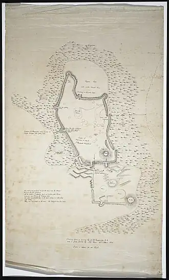The pā itself was roughly oblong in shape, angled to run south-west to north-east. The western, northern and eastern sides were surrounded by swamp, with the main entrance via higher ground at the south. The pā was surrounded by earthen banks topped with wooden palisades.[6] At the south-eastern side was the Kaitangata gate, behind which was a watchtower. The other two main gates, named Hiakarere and Huirapa, were on either side of the south-western corner.[7] Just to the south of this southern palisade was an area devoted to housing and ovens. Within the walls were the major wharenui which were built to face north. The ahu (shrine to the local deity) of the pā was at the northern end, with houses spread across the central area.[8]