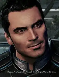 Kaidan is a romance option for a female Shepard in the first game, and their relationship could persist over the entire trilogy depending on the player's choices. He can also be romanced by a male Shepard in Mass Effect 3, where he would reveal his unrequited feelings for the Commander.[4]