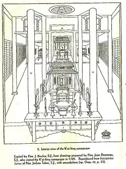 Outside the synagogue was a large hall, the Tz'u t'ang (祖堂; zǔ táng) or "Hall of the Ancestors" where, according to the Portuguese Jesuit Jean-Paul Gozani (1647–1732) who lived in Kaifeng from 1698 to 1718, incense bowls were placed to commemorate the patriarchs and outstanding figures of the Law, as well as various holy men (聖人; shèngrén). This was similar to Chinese rites regarding ancestors, with the difference that no images were allowed.[69][70] Their Pentateuch was divided into 53 sections according to the Persian style.[71]