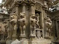 The temple complex is complete in all respects as it has garbagriha (sanctum sanctorum), antarala (inner enclosure), mandapa, a high compound wall, and an entrance gate, the gopuram.[13] The mandapa, which was initially detached, was made part of the main shrine by interposing an ardhamantapa (smaller hall). The pillars of the mandapa have the repetitive features of mythical lion mounts.