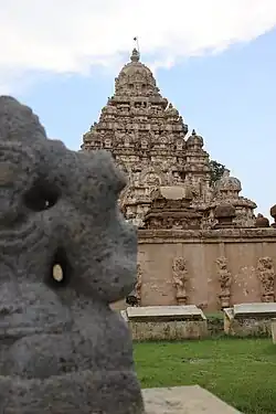 The Kailasanathar Temple, Kanchipuram, also referred to as the Kailasanatha temple, is a Pallava-era historic Hindu temple in Kanchipuram, Tamil Nadu, India. Dedicated to Shiva, it is one of the oldest surviving monuments in Kanchipuram.[1] It reflects a Dravidian architecture and was built around 700 CE by Narasimhavarman II with additions by Mahendravarman III.[2] A square-plan temple, it has a mukha-mandapa (entrance hall), a maha-mandapa (gathering hall) and a primary garbha-griya (sanctum) topped with a four-storey vimana. The main sanctum is surrounded by nine shrines, seven outside and two inside flanking the entrance of the sanctum, all with forms of Shiva. The outer walls of the temple's prakara (courtyard) is also surrounded by cells.[2]