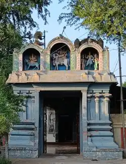 The temple has a beautiful nandhi mandapa. [2] Facing south, it has an entrance. In the west stuccos of Shiva, Parvati are found sitting on rishaba. They are flanked by Vinayaka, Subramania with his consorts Valli and Deivanai. Vinayaka and Sunbramania are found with their vahanas mouse and peacock respectively. After the entrance, in the front mandapa the shrine of the Goddess is found. In the left, facing east, the shrine of the presiding deity is found. In the outer prakara shrines of Vinayaka, Subramania with his consorts Valli and Deivanai, Gajalakshmi, Chandikesvarar and Navagraha are found. The shrine of Navagraha is found in lotus shape. Very near to them nandhi mandapa is found.[3]