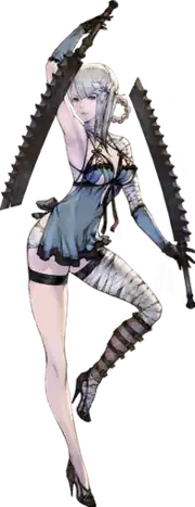Korean illustrator D.K was responsible for Kainé's character design.[24] Her early design was less provocative, having a long dress and feminine manner which hid her violent personality.[2] Yoko's request was for a character with one arm and one leg exposed. D.K's designs shocked Yoko and other members of staff as they mostly revolved around underwear.[5] Yoko attempted to adjust the design himself by adding a "front flap" to hide her most exposed areas.[25] While fearing it would be vetoed, Yoko successfully pushed through her final design.[5] For the remaster, the staff wanted to bring D.K back for Kainé's redesign, but he had moved back to Korea and was unable to work with them, though he supported both the remaster and the new artist.[26] Kainé was instead redesigned by Akihiko Yoshida, lead character designer on Nier: Automata. Yoshida was invited onto the project, alongside fellow artists Kimihiko Fujisaka and Toshiyuki Itahana, as an earlier collaborator with Yoko.[27]