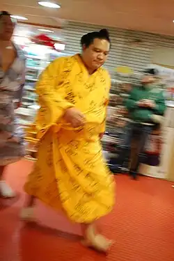 Kaiō was solidly a yotsu-sumo wrestler, favouring a right hand outside, left hand inside grip (hidari-yotsu) on his opponent's mawashi or belt.[34] He was well known for his power in the hidari-yotsu position, which even yokozuna Takanohana at his peak had trouble countering.[35] His most common winning technique was a straightforward yori-kiri or force out, which accounted for a third of his career victories, followed by oshi-dashi or push out.[36] He often used his right hand outer grip to win by uwatenage (the overarm throw), which was his most common throwing move. Two of his yūshō-winning bouts were decided by uwatenage, and he was noted for his exceptional power and technique when using this throw.[37] More controversially, he was also known for employing kotenage, (the armlock throw), a technique that can injure the opponent.[38] Kaiō unintentionally caused a number of injuries with this technique over the years, including Tochinonada in 1999, who sustained long-term damage to his elbow, and Kotoryū in March 2001, who suffered a broken arm.[39]