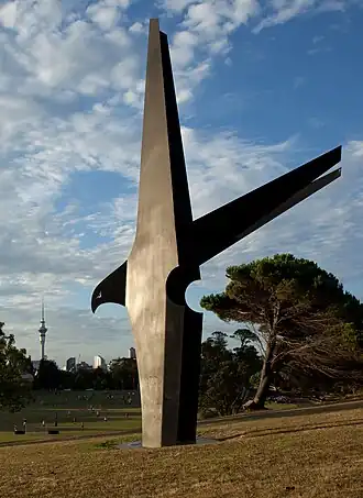 Kaitiaki (English: "Guardian")[2] is an 11.8-metre-high (39 ft) black powder-coated steel sculpture that depicts a kāhu pōkere (harrier hawk).[2][4] Graham chose a kāhu pōkere for the piece due to its appearance in Ngāti Whātua and Tainui oral histories as a guardian that was present in Aotearoa New Zealand prior to the first inhabitants.[3][4]