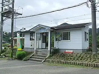 The station, which is unstaffed, consists of two side platforms serving two tracks, with a siding. The station building, a narrow simple wooden structure in a basic Japanese style with a tiled roof, as destroyed by a fire in 2018. The station is unstaffed. Access to the opposite platform is by means of a footbridge.[2][3][4]