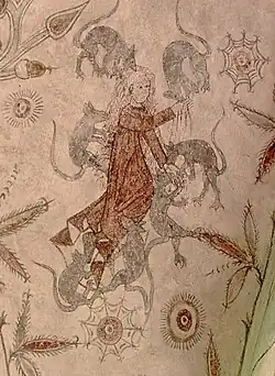 Late medieval depictions of a female saint, typically equipped with a spindle and spinning, and with rats either on the thread, on the saint or in the surroundings, are known from the Swedish churches of Film, Forssa (vanished), Harg, Kaga, Njutånger as well as possibly Viksta, and Hattula in Finland.[1][2][3] Some of these also have speech scrolls identifying the saint. Similar depictions are also known from Germany, including on an altarpiece in the monastery of Adelberg, Baden-Württemberg under the name Cutubilla. A woodcut from the middle of the 15th century in the Kupferstichkabinett in Berlin also depicts the saint, and may indeed be indicative of how depictions of her were spread to Sweden, using early printing techniques.[4] A large number of variations of the saint's name are known. From Sweden, the forms Kakwkylla, Kacacila, Kakitkaina, K(akuk)olla (possibly), and Katakyla (possibly) are known. From German sources, the names Cakukilla, Cutubilla (or Cutubilla von Württemberg),[5] Kakukabilla, Kakukilla and Kukakille have been identified.[1]