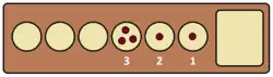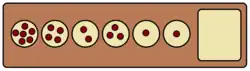 As mentioned above, if the last seed sown by a player lands in that player's store, the player gets an extra move. A clever player can take advantage of this rule to chain together many extra turns. Certain configurations of a row of the board can in this way be cleared in a single turn, that is, the player can capture all stones on their row, as depicted on the right. The longest possible such chain on a standard Kalah board of 6 pits lasts for 17 moves. On a general n-pit board, the patterns of seeds which can be cleared in a single turn in this way have been the object of mathematical study.[9] One can prove that, for all n, there exists one and only one pattern clearable in exactly n moves, or equivalently, one and only one clearable pattern consisting of exactly n seeds.
