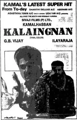 Kalaignan (transl. Artist) is a 1993 Indian Tamil-language thriller film written and directed by G. B. Vijay and produced by Ramkumar Ganesan. It stars Kamal Haasan and Farheen (credited as Bindiya) while Sivaranjani, Sindhuja, Nirmalamma and Chi. Guru Dutt play supporting roles. It was released on 14 April 1993 Tamil New Year. Although it received positive reviews, the movie attracted only elite audience and underperformed at the box-office.