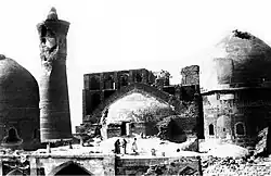 About a hundred years after its construction, the tower so impressed Genghis Khan that he ordered it to be spared when all around was destroyed by his men.[5] It is also known as the Tower of Death, because until as recently as the early twentieth century criminals were executed by being thrown from the top. Fitzroy Maclean, who made a surreptitious visit to the city in 1938, says in his memoir Eastern Approaches, "For centuries before 1870, and again in the troubled years between 1917 and 1920, men were cast down to their death from the delicately ornamented gallery which crowns it."[6]