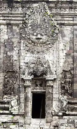 The temple stands on a square 14.20 meters sub-basement. The temple plan is cross-shaped, and designed as a twelve-cornered polygon. Each of the four cardinal points has stairs and gates adorned with Kala-Makara and rooms measuring 3,5 square meters. No statue is to be found in the smaller rooms facing north, west, and south; but the lotus pedestals suggest that the rooms once contained statues of Bodhisattvas. The temple is richly decorated with Buddhist figures such as the Bodhisattva and Gana. The Kala Face above the southern door has been photographed and used by several foreign academics in their books to give an idea of the artistry in stone by Central Javanese artists of a millennia ago. Niches where the statues would have been placed are found inside and outside the temple. The niches adorned an outer wall intricately carved with Kala, gods, and divinities in scenes depicting the svargaloka, the celestial palace of the gods, apsaras, and gandharvas.