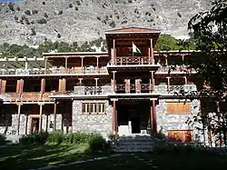 Construction of the museum started in 2001 and was completed in 2005.[4] Greek Volunteers, a Greek NGO, is credited with the building efforts under teacher Athanasios Lerounis.[5] The Greek government body, Hellenic Aid, helped them in their efforts.[6] The museum and its adjacent grounds cover around four kanals of land. A combination of traditional design and modern techniques was used in its construction. Walls made of stone cover the concrete framework, while the characteristic parallel wooden beams and carved verandas also feature in its design. A temple dedicated to Jestak, a local deity believed to protect generations, has also been constructed near the entrance.[7]