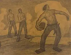 In Estonian (mainly East Estonian) legends, Kalevipoeg carries stones or throws them at enemies, and also uses planks edgewise as weapons, following the advice of a hedgehog.[4] He also forms surface structures on landscape and bodies of water and builds towns. He walks through deep water. Kalevipoeg eventually dies after his feet are cut off by his own sword owing to his own prior—and fatally ambiguous—instructions.