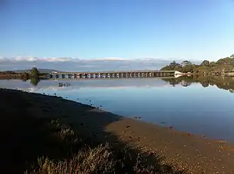 The southern end of the Kalgan River has two bridges of note: the Upper Kalgan bridge and the Lower Kalgan Bridge. The Lower Kalgan Bridge was built from 1906 and opened in 1908. At 900 feet (274 m) in length, it was the longest of its kind over water in the state at the time. At this time, the bridge had a special navigation span, 40 feet (12 m) wide at the deepest part of the river. The original bridge remained in place until 1958, when it was replaced, but the navigation span trusses were removed for preservation and are now on display in the park at the western end of the bridge.[15]