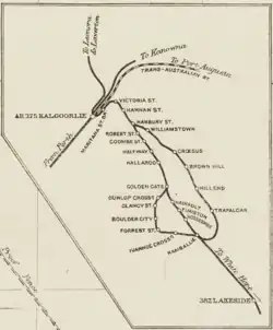 The Kalgoorlie-Gnumballa Lake and Boulder Townsite Loop Railways Act 1897, an act by the Parliament of Western Australia assented to on 23 December 1897, authorised the construction of an 11-kilometre (6.8 mi) long railway line from the Kalgoorlie railway station to Gnumballa Lake as well as a 3.14-kilometre (1.95 mi) loop railway branching off from the former to the Boulder railway station.[4] This act was retrospective, authorising the construction of the already completed tramway, which thereby officially became a railway.[2] The Boulder loop was also referred to as the Inner Circle.[5]