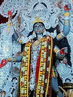Kali Puja (ISO: Kālī Pūjā), also known as Shyama Puja or Mahanisha Puja,[1] is a festival originating from the Indian subcontinent, dedicated to the Hindu goddess Kali. It is celebrated on the new moon day (Dipannita Amavasya) of the Hindu calendar month of Ashwayuja (according to the amanta tradition) or Kartika (according to the purnimanta tradition). The festival is especially popular in the region of West Bengal, and other places like Mithila, Jharkhand, Odisha, Assam, and Tripura. Along with the neighbouring country of Bangladesh.