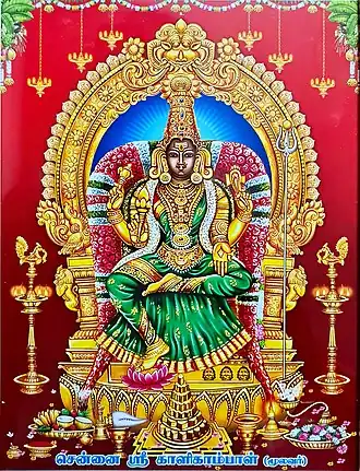 The temple was originally located closer to the sea shore at the site of the present-day Fort St. George.[1] When the British East India Company built the fort, the temple was relocated to the current site on 1 March 1640 CE[1] and the construction continued until 1678.[2] Chhatrapati Shivaji, the 17th century Maratha warrior-king and the founder of Maratha Empire, had paid a visit in this temple on 3 October 1677.[3][4] It is believed that a fierce form of Goddess was held in worship earlier and that this form was replaced with the shanta swaroopa (calm posture) form of Goddess Kamakshi by Adi Shankara. Tamil poet Subramaniya Bharathi was a regular visitor of the temple in the early 20th century.[4] The Tamil devotional hymn Ullam Uruguthaiya written by Andavan Picchi in 1952 was conceived and composed at the temple premises.[1]