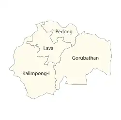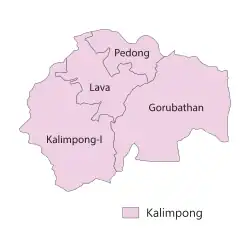 Apart from the Kalimpong municipality that consists of 23 wards, the subdivision contained rural areas of 42 gram panchayats. As of 2021, these areas divided under four community development blocks: Kalimpong–I, Lava, Pedong, and Gorubathan.[6] Prior to the bifurcation in 2021, Lava and Pedong blocks constituted a single block termed Kalimpong–II.[7]