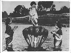 A still from the film Kaliya Mardan showing child Krishna vanquishing the venomous serpent Kaliya.